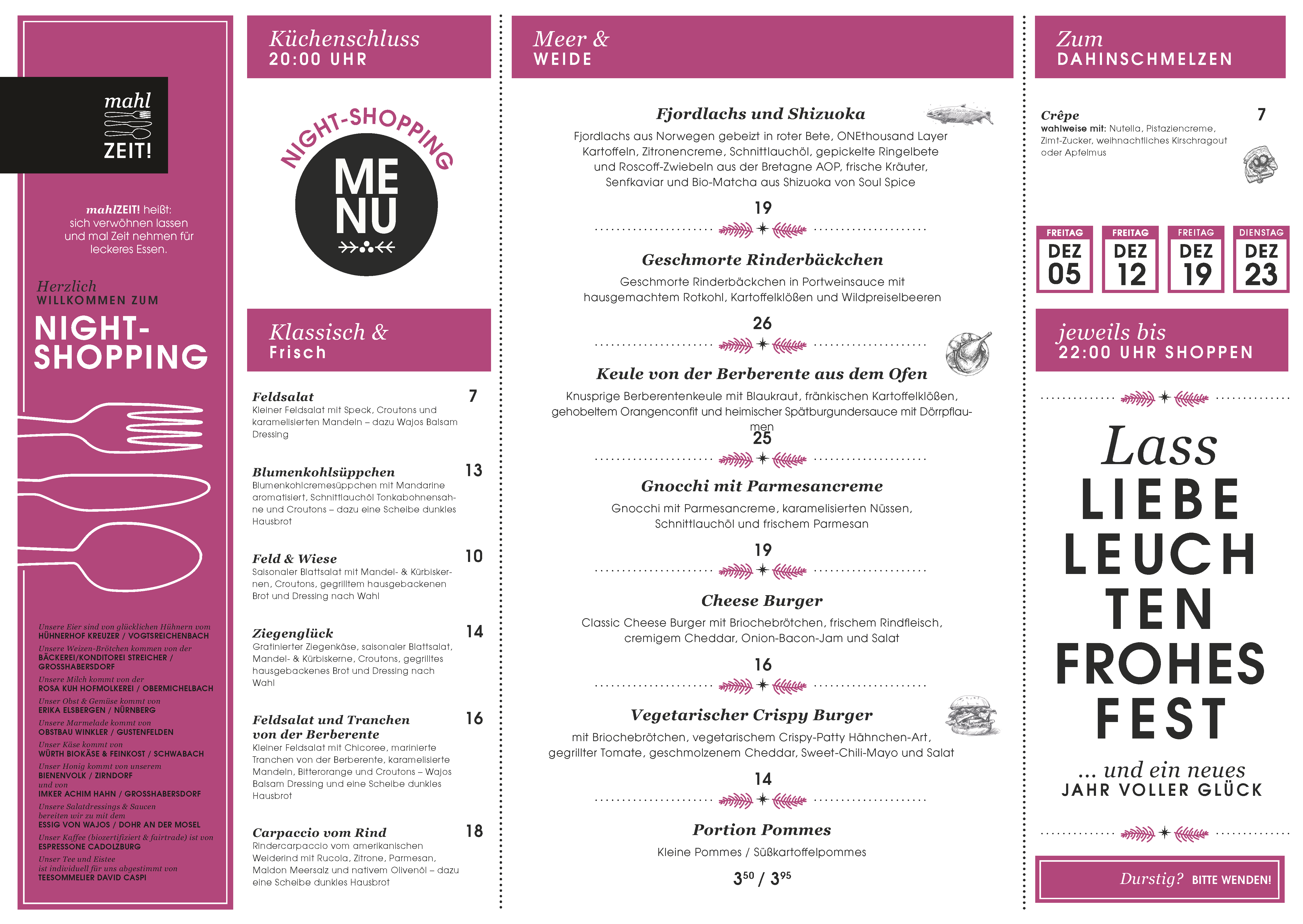 Unser Restaurant mahlZEIT! ist an diesen Abenden ebenfalls geöffnet und wird Sie bis in die Abendstunden mit feinen Gerichten verwöhnen. An den Nightshopping-Tagen macht unsere Küche um 16:45 Uhr eine kurze Pause, aber keine Sorge: Ab 18:00 Uhr können Sie sich mit einer exklusiven Event-Karte wieder kulinarisch verwöhnen lassen – perfekt abgestimmt auf den Abend. Küchenschluss ist um 20 Uhr. Unser Team macht Ihr Weihnachtsshopping zu einem genussvollen Erlebnis.Reservieren Sie sich jetzt Ihren Platz im Restaurant.