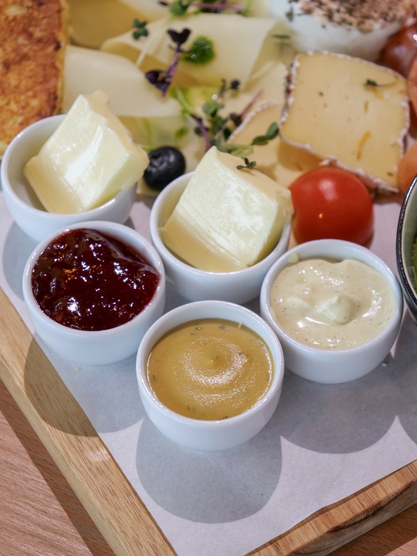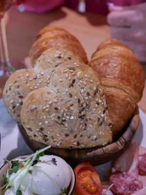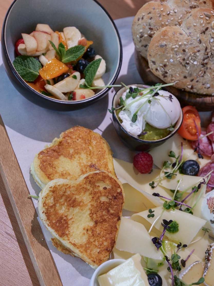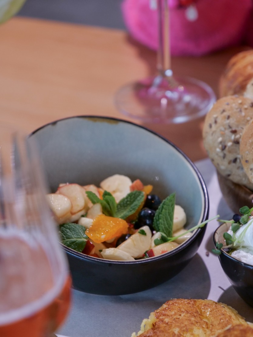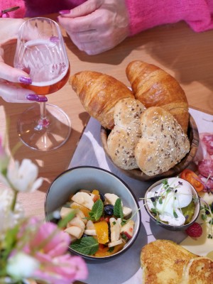 Freut euch auf einen reich gefüllten Gebäckkorb mit Herzbrötchen, Croissants und Hausbrot, begleitet von Würnsreuther Bio-Zitronenfrischkäse, Bio Coburger Butterkäse und cremiger Burrata mit Kräuteröl. Feine Akzente setzen unsere Bio „Salami Saucisson“ aus den Ardennen, hausgemachter Himbeerfrischkäse und hausgebeizter Lachs. Dazu servieren wir Avocadomash, zwei perfekt pochierte Eier sowie einen süßen Abschluss aus French Toast mit frischem Obstsalat und Vanillecreme. Natürlich dürfen Marmelade und Butter nicht fehlen.