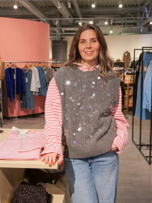 Die Fia Knit Vest ist ein leicht verkürzter Pullunder mit glänzenden Pailletten auf der Vorderseite. Ideal für kühle Tage, lässt sich dieses Strick-Westen-Design sowohl elegant als auch leger kombinieren.
