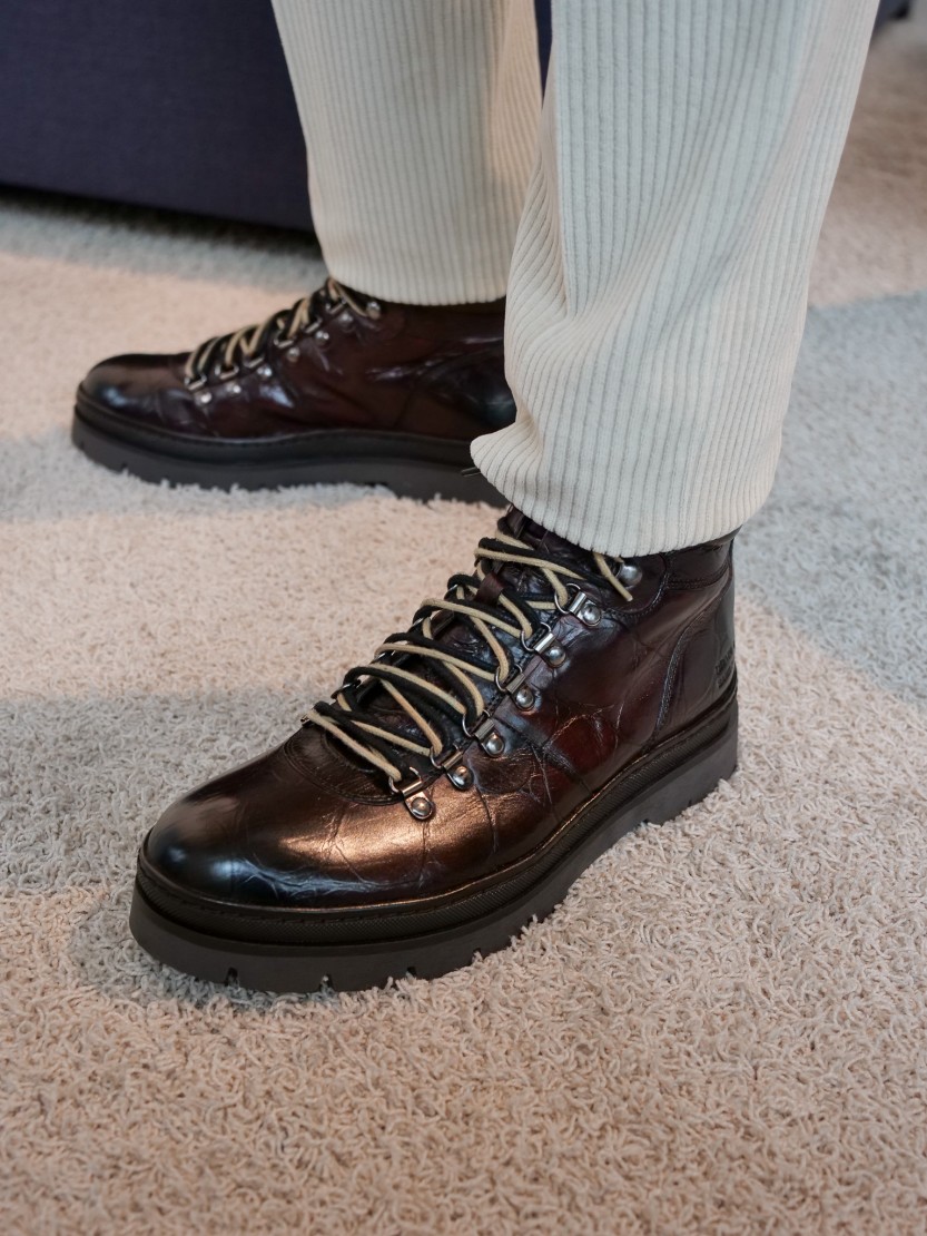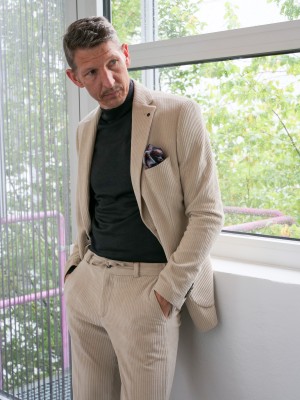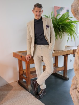 Der helle Cordanzug von Zuitable vereint zeitlose Eleganz mit sportlicher Lässigkeit und ist die perfekte Wahl für alle, die Anzug tragen möchten, ohne dabei klassisch wirken zu wollen. Kombiniert mit einem schwarzen Rollkragenpullover entsteht ein Look, der entspannt und zugleich stilvoll wirkt. Highlight des Outfits sind die geschnürten Stiefeletten von Melvin & Hamilton, die dem Ensemble eine elegante Note verleihen.
