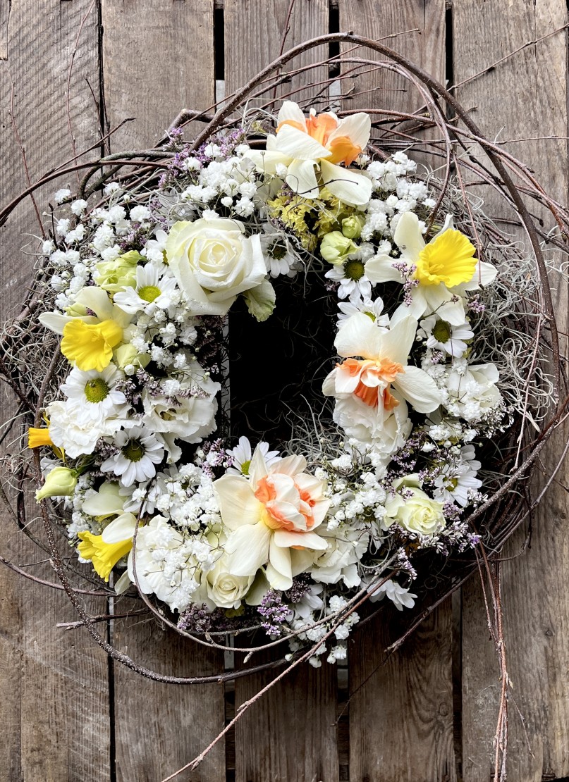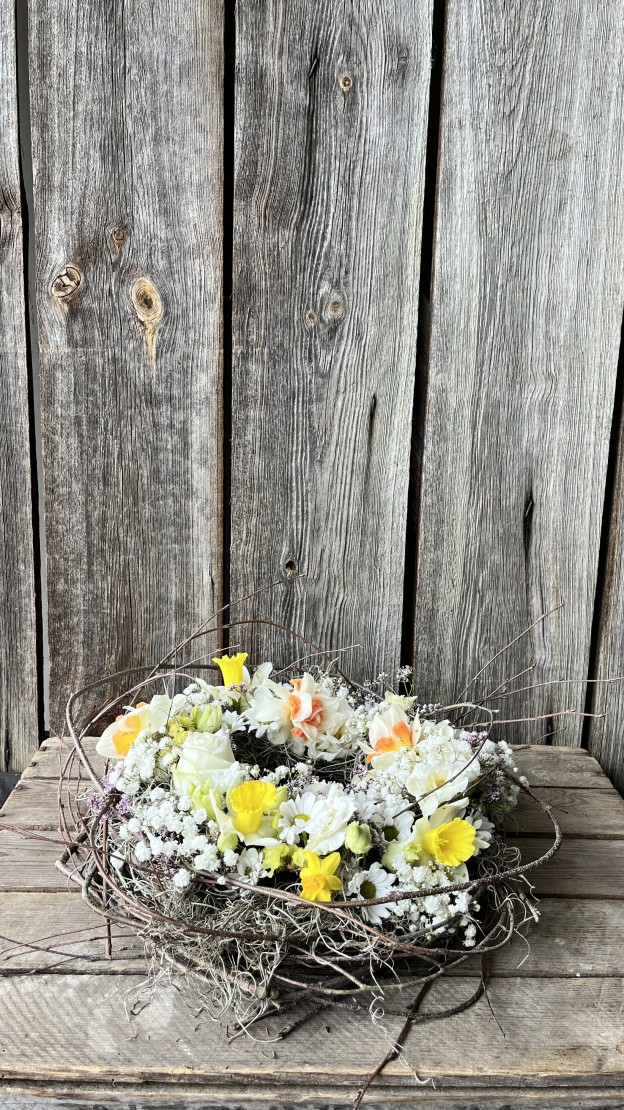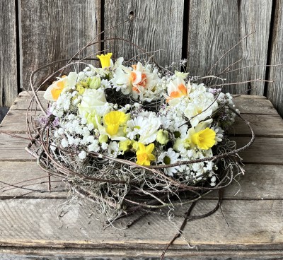 Gestalten Sie Ihren eigenen, liebevoll arrangierten Osterkranz. Unter fachkundiger Anleitung entsteht ein dekoratives Werkstück aus frischen Blumen, die auf Steckschaum arrangiert werden – zart, verspielt und voller Leichtigkeit. Verschiedenes Material steht Ihnen zur Verfügung, sodass Sie Ihren Kranz individuell gestalten können.